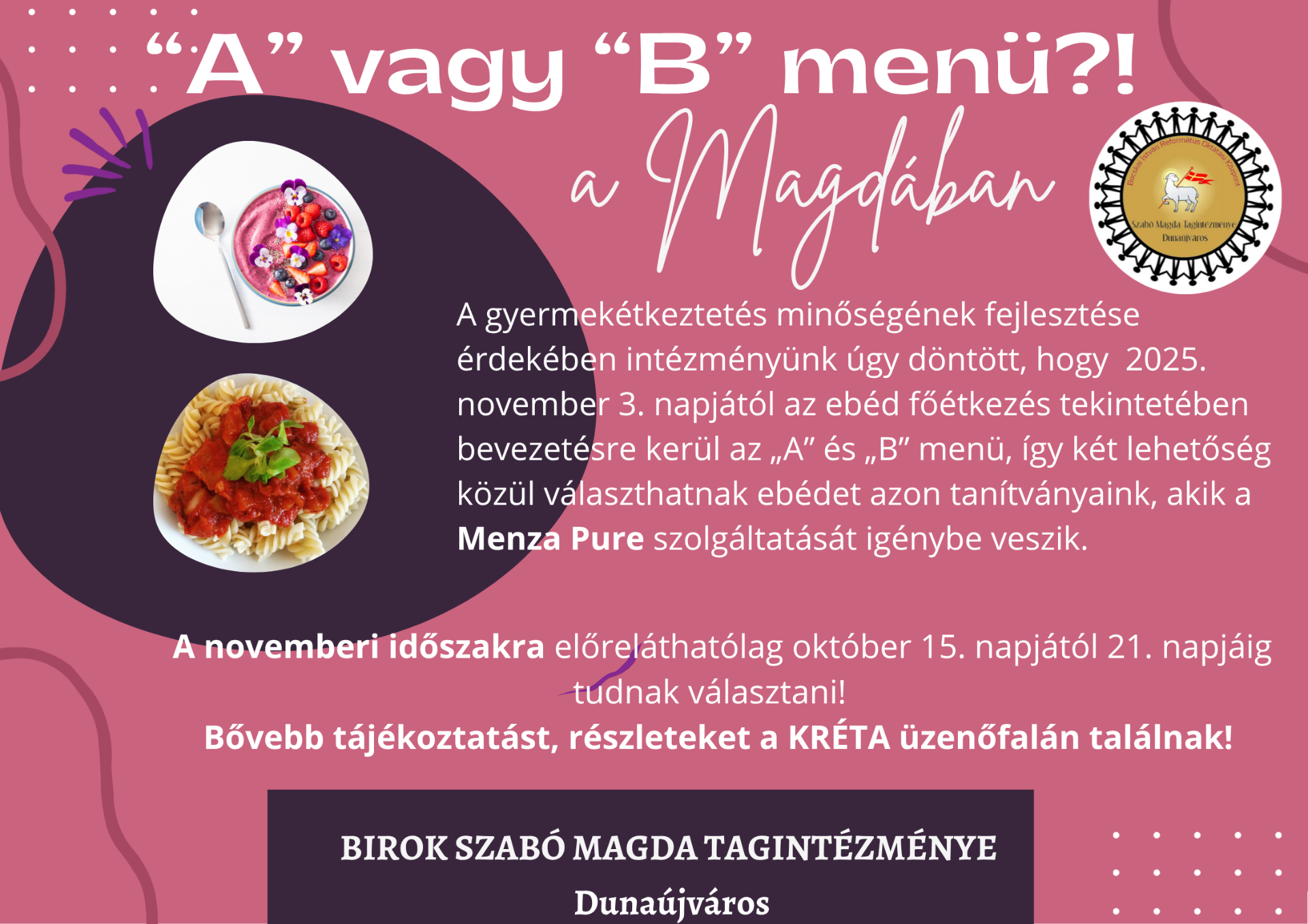 A gyermekétkeztetés minőségének fejlesztése során intézményünk úgy döntött, hogy 2025. november 3. napjától az ebéd főétkezés tekintetében bevezetésre kerül az "A" és "B" menü, így két lehetőség közül választhatnak ebédet azok az általános iskolások, akik a Menza Pure szolgáltatását igénybe veszik.