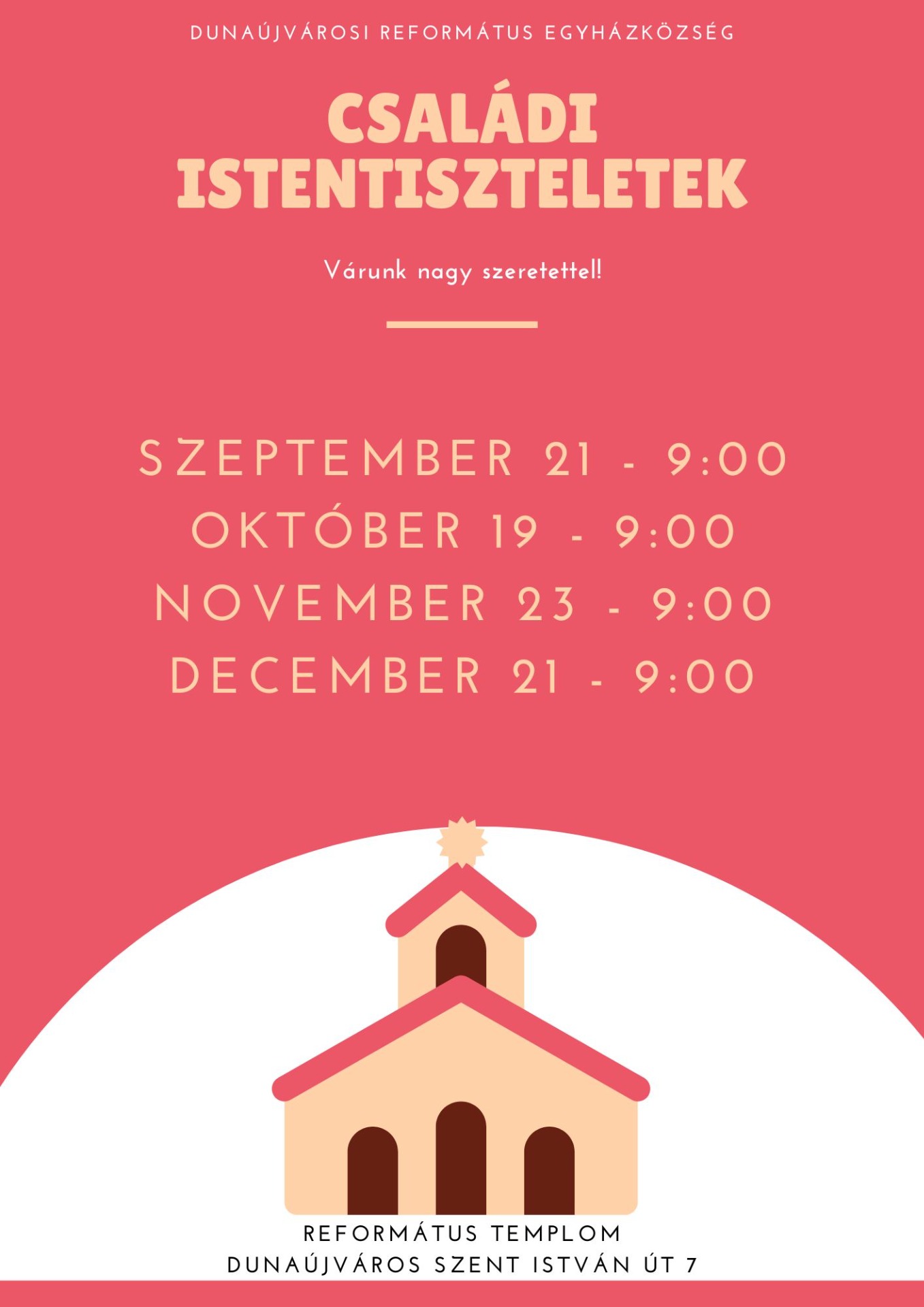 Az alsós gyermekek számára a családi istentiszteleten való részvételt igazoljuk a Szabó Magda Református Általános Iskola felé, így könnyen teljesíthető az istentisztelet-látogatási kötelezettségük. A családi istentiszteletre tehát az alsósokat várjuk, míg a felsősök számára a vasárnap 10:00-kor kezdődő istentiszteletet ajánljuk. Minden vasárnap 10.00 órától gyermek-istentisztelet is van. (Dunaújváros, Szent I. u.7.)