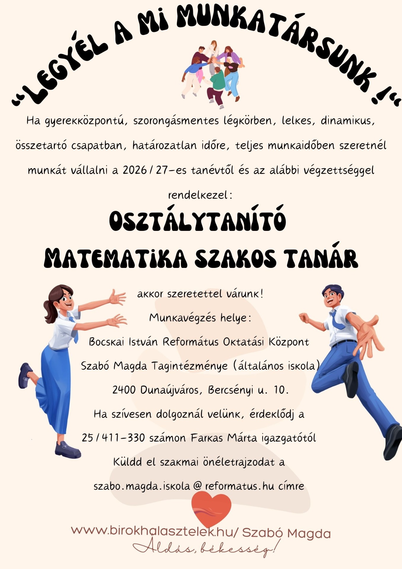 Intézményünk dinamikus, gyermekcentrikus és lelkes tantestülete új kollégát keres osztálytanító és matematika szakos pedagógus munkakörbe a 2026/27-es tanévtől.