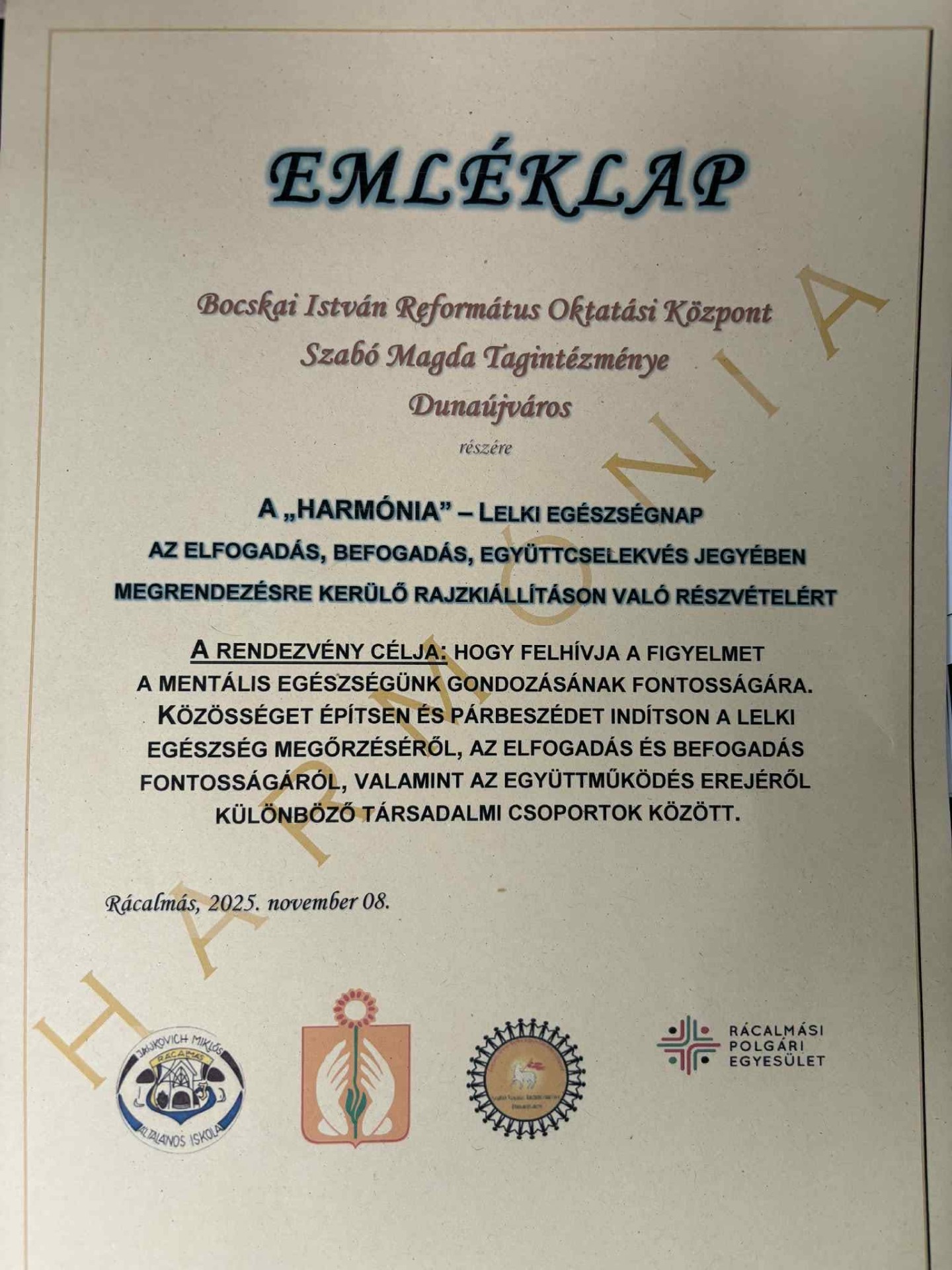 A mai napon egy hangulatos kiállítás megnyitóján jártunk. Már júniusban felkérést kaptunk, hogy vegyünk részt a „HARMÓNIA” – Lelki egészség, elfogadás, befogadás, együttcselekvés jegyében című programhoz. A felkérésnek Farkas Márta igazgatónő és Szalavics Eszter örömmel tett eleget. Az eseményen lehetőségünk adódott bemutatni iskolánkat, így igazgatóasszonyunk zenés, képes összeállítással mutatta be az intézményünkben zajló munkát. A programhoz egy rajzpályázatot is meghirdettek “Mai hangulatom” címmel. Tanulóink örömmel alkottak erre a felhívásra, így iskolánkból tizenhét gyermekünk Szilágyi Victória, Papp János, Dragumirecu Emilia Elizabeth, Kiss Éva Mercédesz, Zsuga Bíborka, Mészáros Regina, Balogh Elza, Szucsány Hanga, Magyari Fanni, Balogh Odett, Kövedi Abigél Enikő, Staub Boróka, Fülöp Dóra, Hegedűs Luca Léna, Kovács Rosta Ágnes, Vasárus Hanna, Boldis István munkája díszíti a Rácalmási Művelődési Ház rendezvénytermét. Köszönjük a meghívást! Gratulálunk tanulóink munkájához!