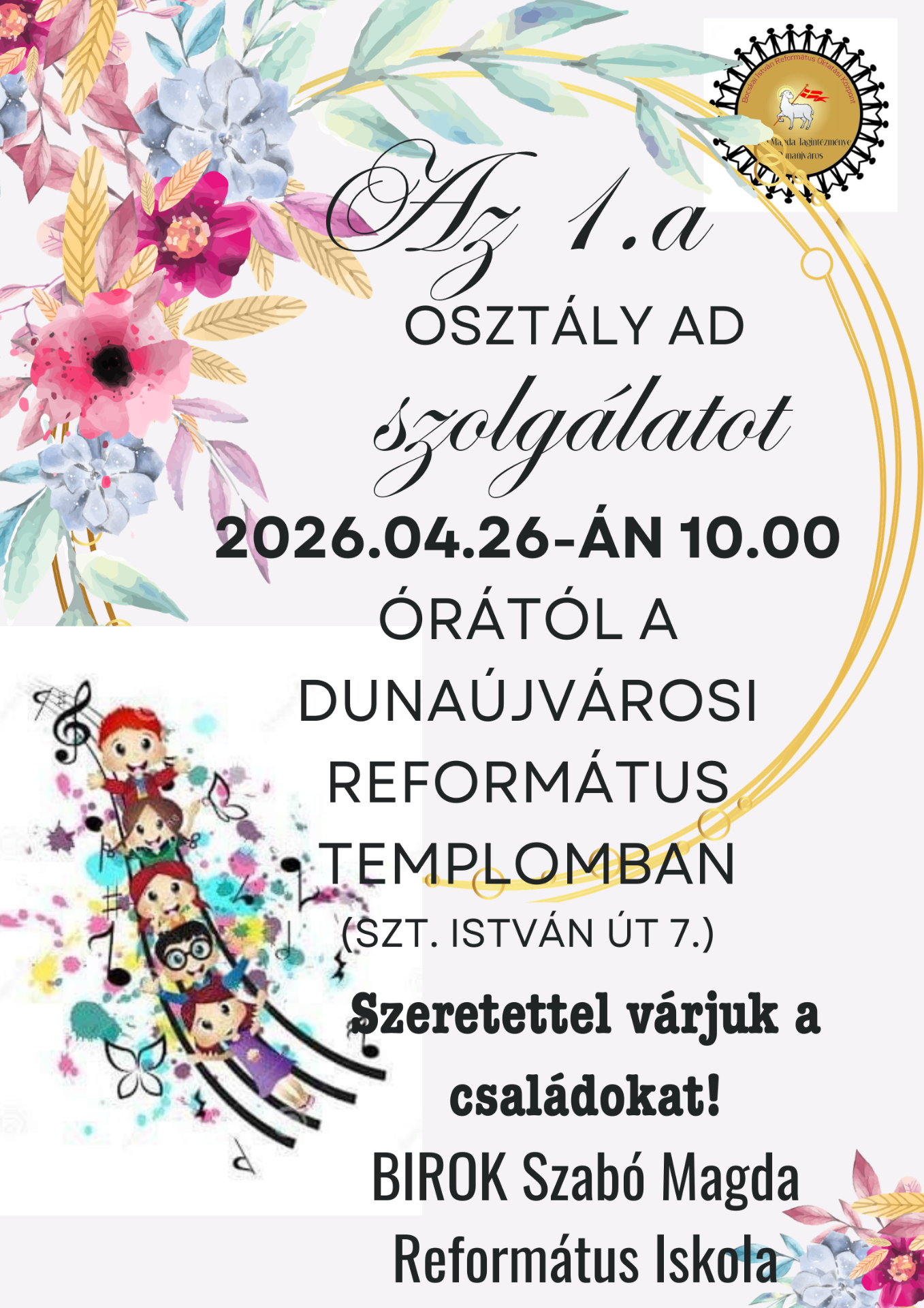 Iskolánk 1.a osztálya ad szolgálatot 2026.04.26-án 10.00 órától a dunaújvárosi református templomban.